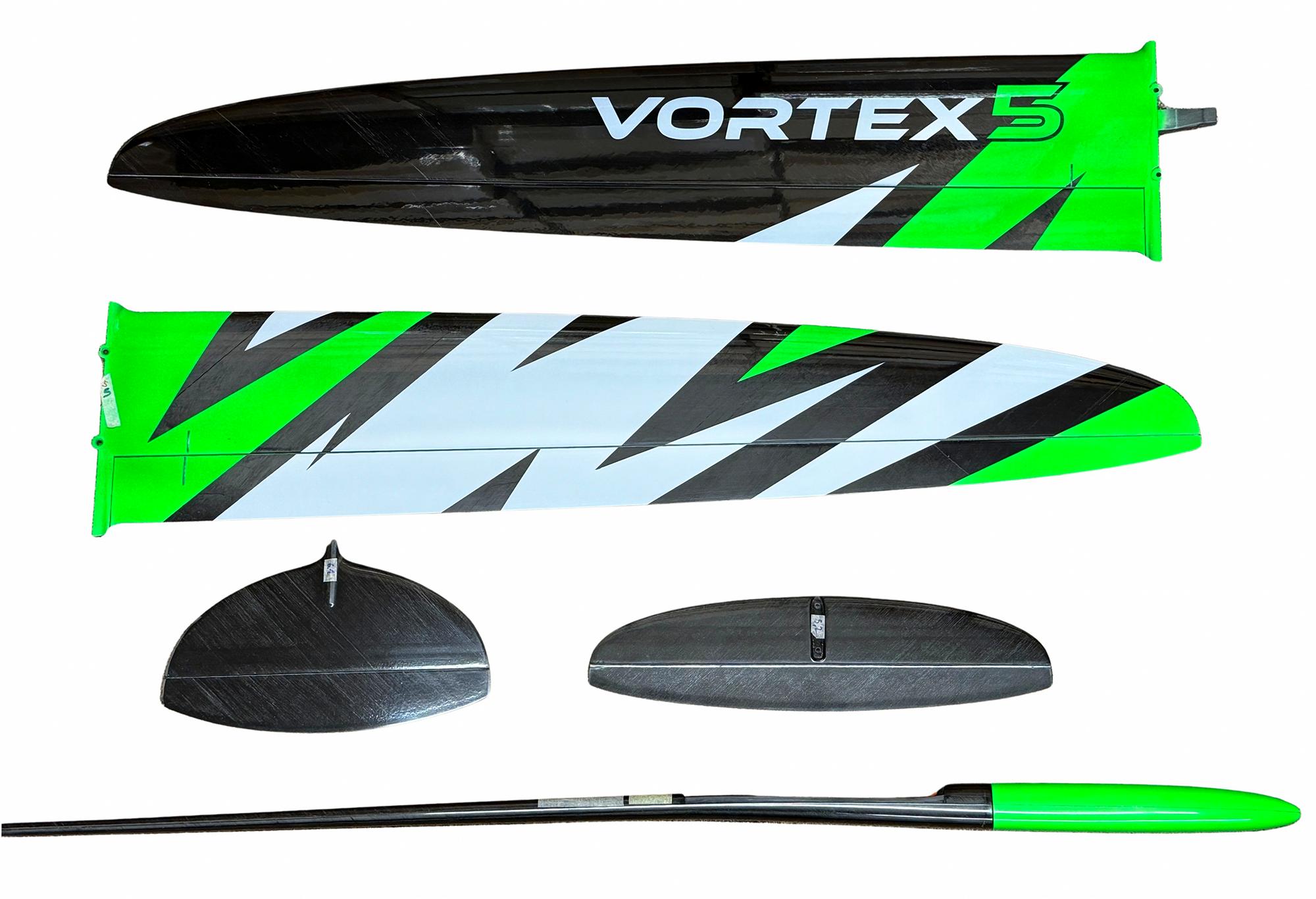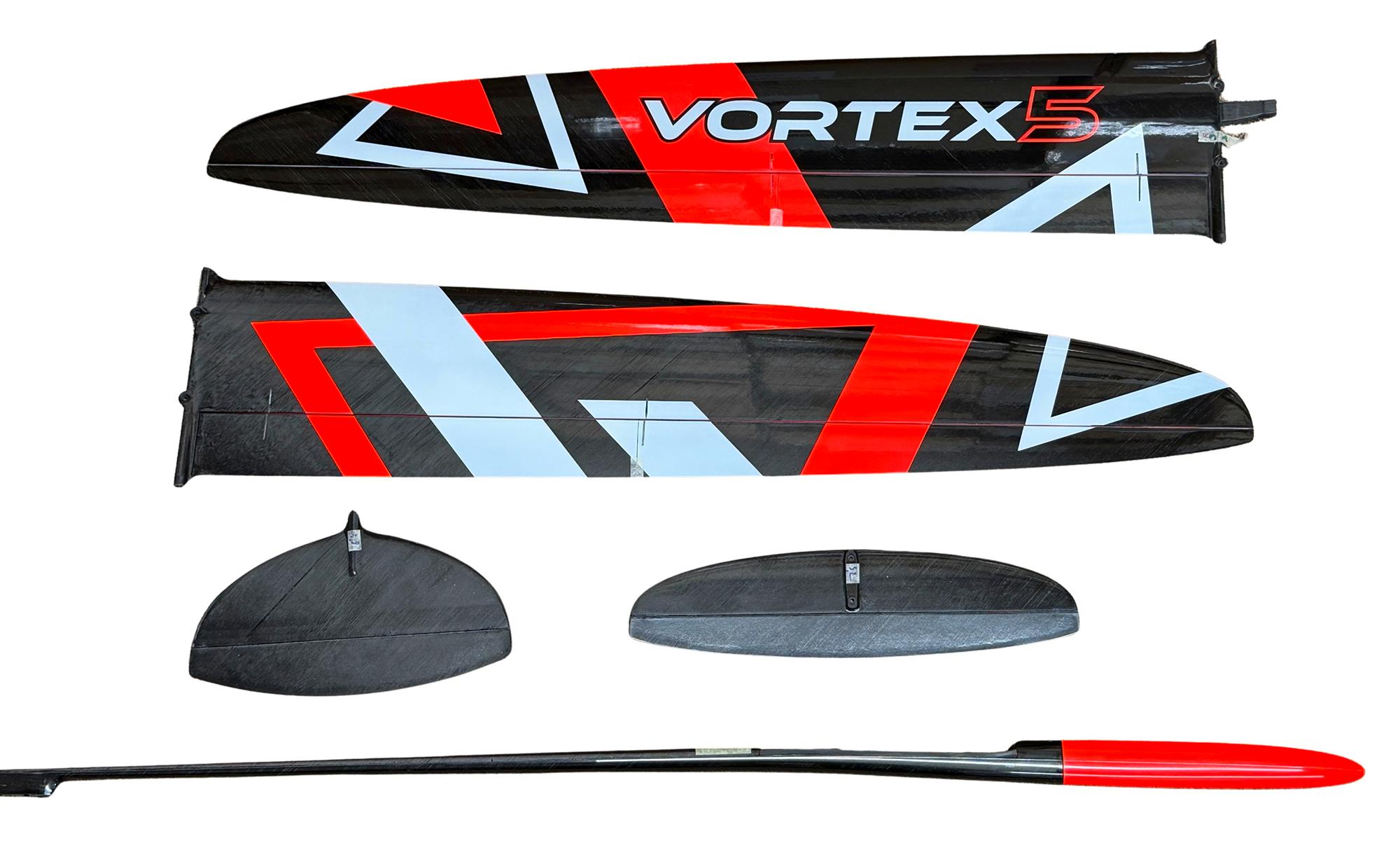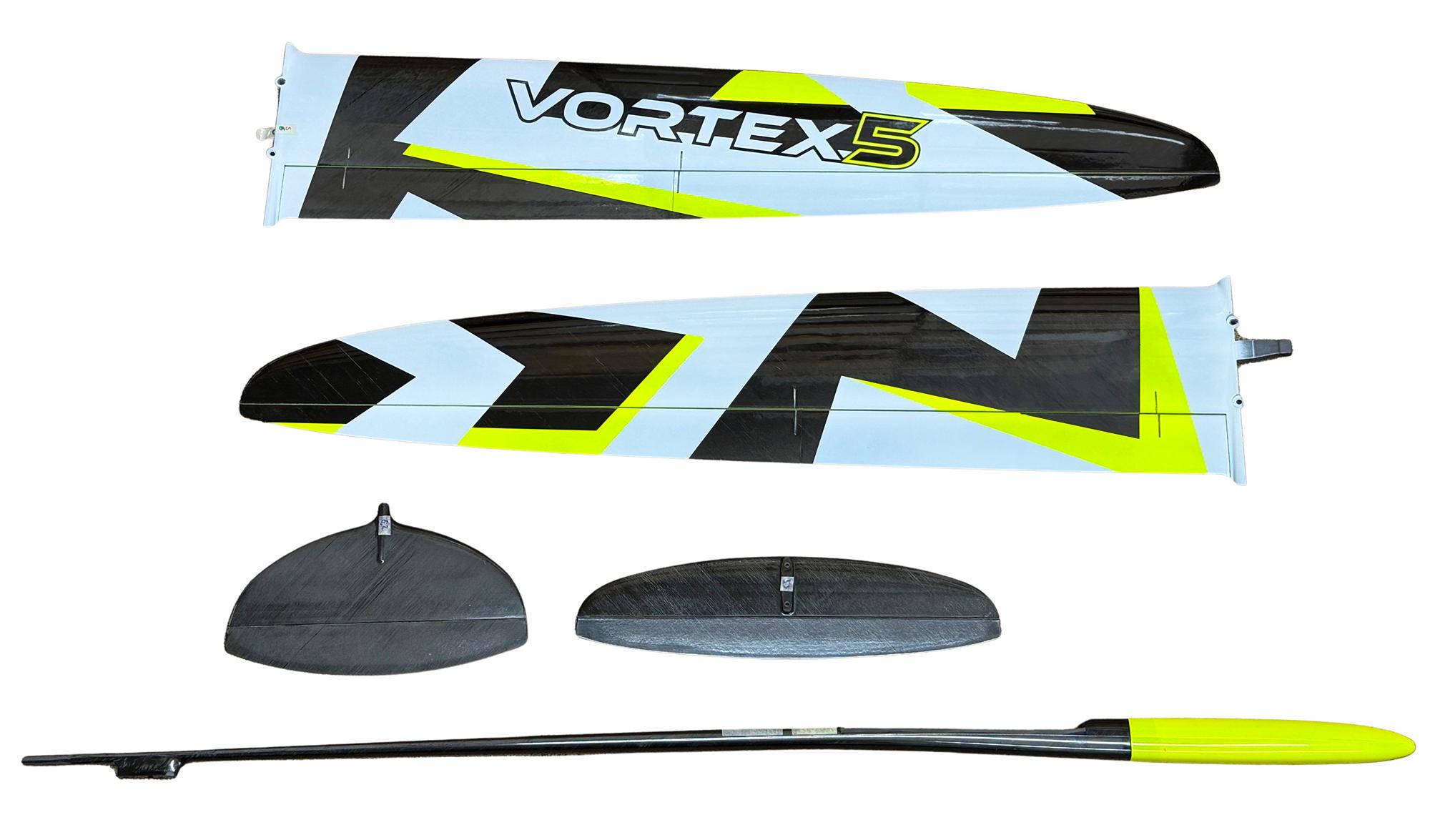 The ground breaking DS Composites Vortex 5 with a four control surface wing DLG is probably the most highly regarded DLG currently available. Many top pilots find the extra controllability of the separate flap and aileron control surfaces gives greater manoeuvrability with less control surface drag in thermal turns and normal flight modes. Also the ability to have crow braking on landing greatly improves control on approach and landing, reducing the likelihood of fumbled catches and resultant damage. Plus the thoroughbred low drag design of the Vortex 5 and excellent surface finish give high launches (up to 80m) and an excellent glide angle. All the models have two piece wings and removable tailplanes and fins to aide transport and storage. We also stock the 4 servo (flaperon) version for those pilots who prefer the simplicity and lighter weight of this configuration.