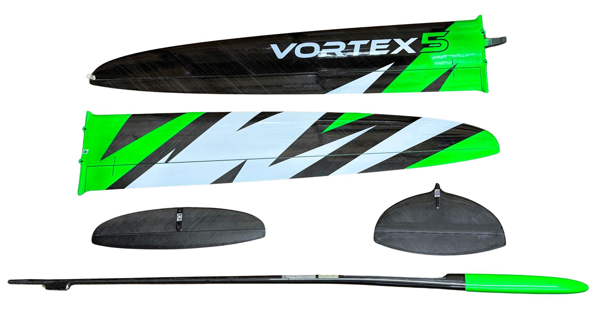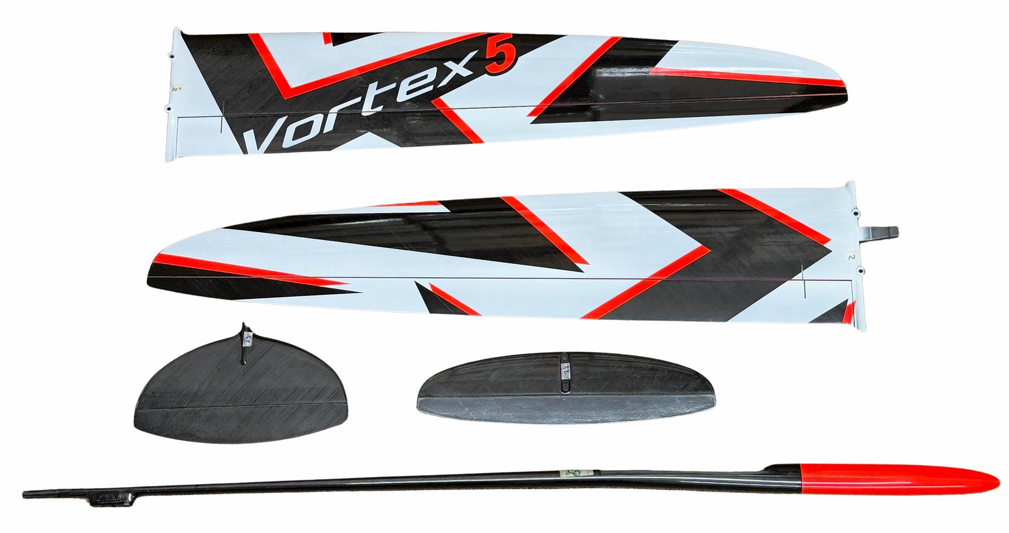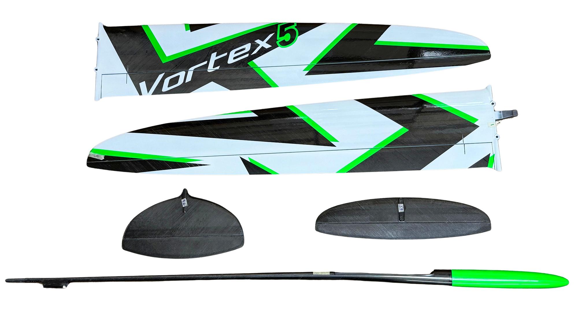 The ground breaking DS Composites Vortex 5 with a four control surface wing DLG is probably the most highly regarded DLG currently available. Many top pilots find the extra controllability of the separate flap and aileron control surfaces gives greater manoeuvrability with less control surface drag in thermal turns and normal flight modes. Also the ability to have crow braking on landing greatly improves control on approach and landing, reducing the likelihood of fumbled catches and resultant damage. Plus the thoroughbred low drag design of the Vortex 5 and excellent surface finish give high launches (up to 80m) and an excellent glide angle. All the models have two piece wings and removable tailplanes and fins to aide transport and storage. We also stock the 4 servo (flaperon) version for those pilots who prefer the simplicity and lighter weight of this configuration.