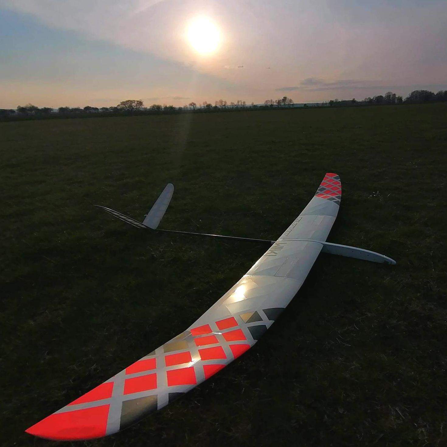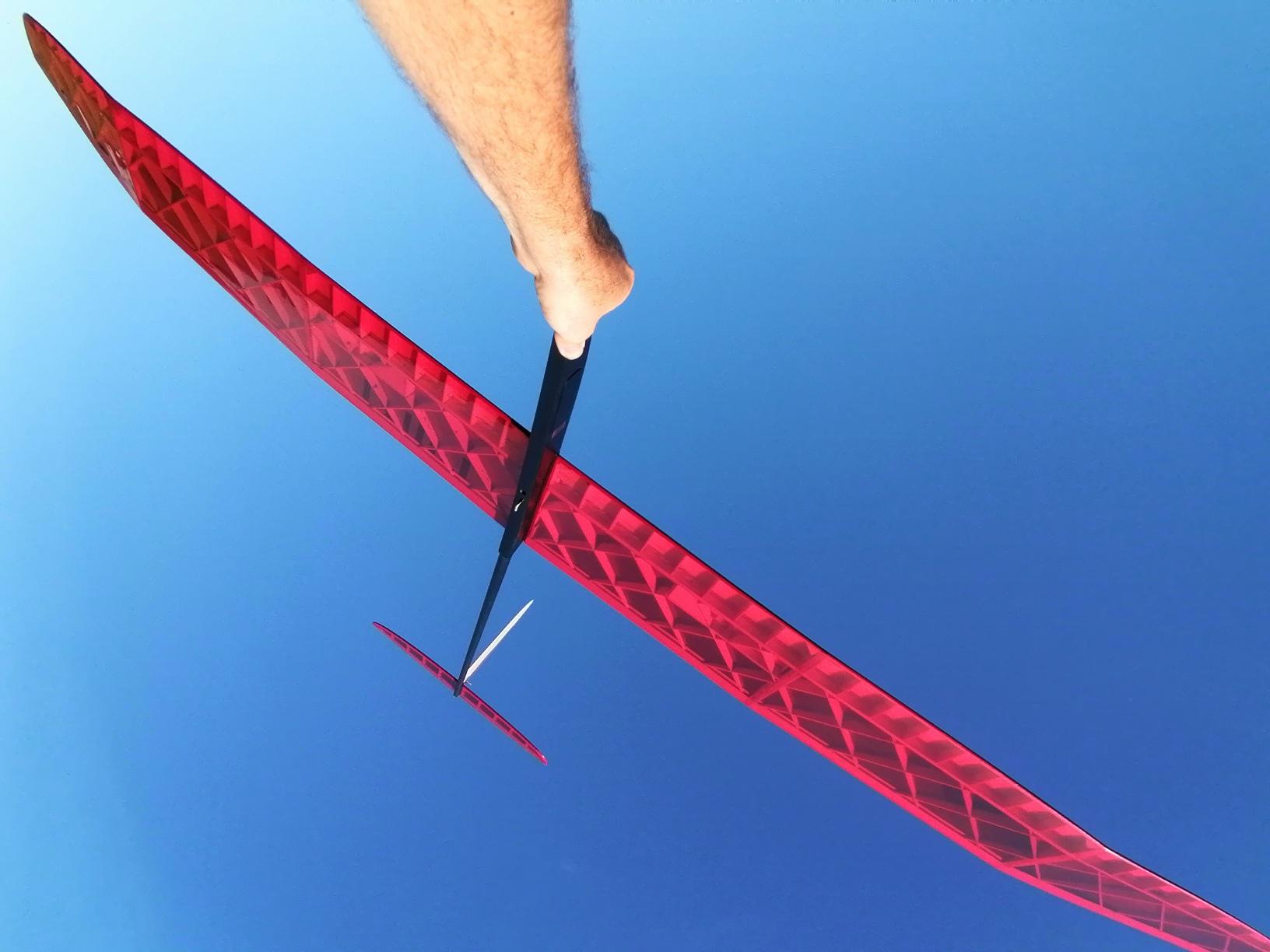 Nice flyerWiki covers ground quickly with its clean lines. Keep the speed up a bit; too slow and it gets loose. I set the CG slightly forward of the recommended range and bumped up exponential. Low roll inertia from its light wing panels clearly signals air currents and helps the plane core itself similar to free flight models. This plane seems to know what it's doing and flies best with minimal stick inputs from my thumbs. Spoilers are nicely sized with a small amount of 'up' elevator mixed in when they're deployed. Makes for stable, predictable approaches.